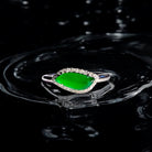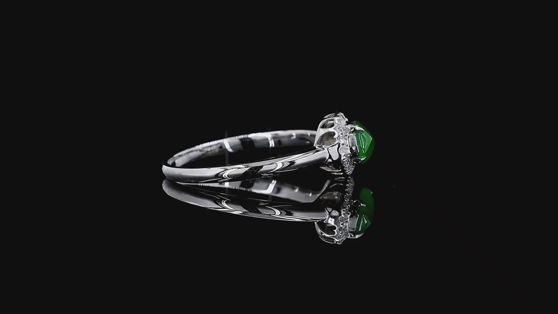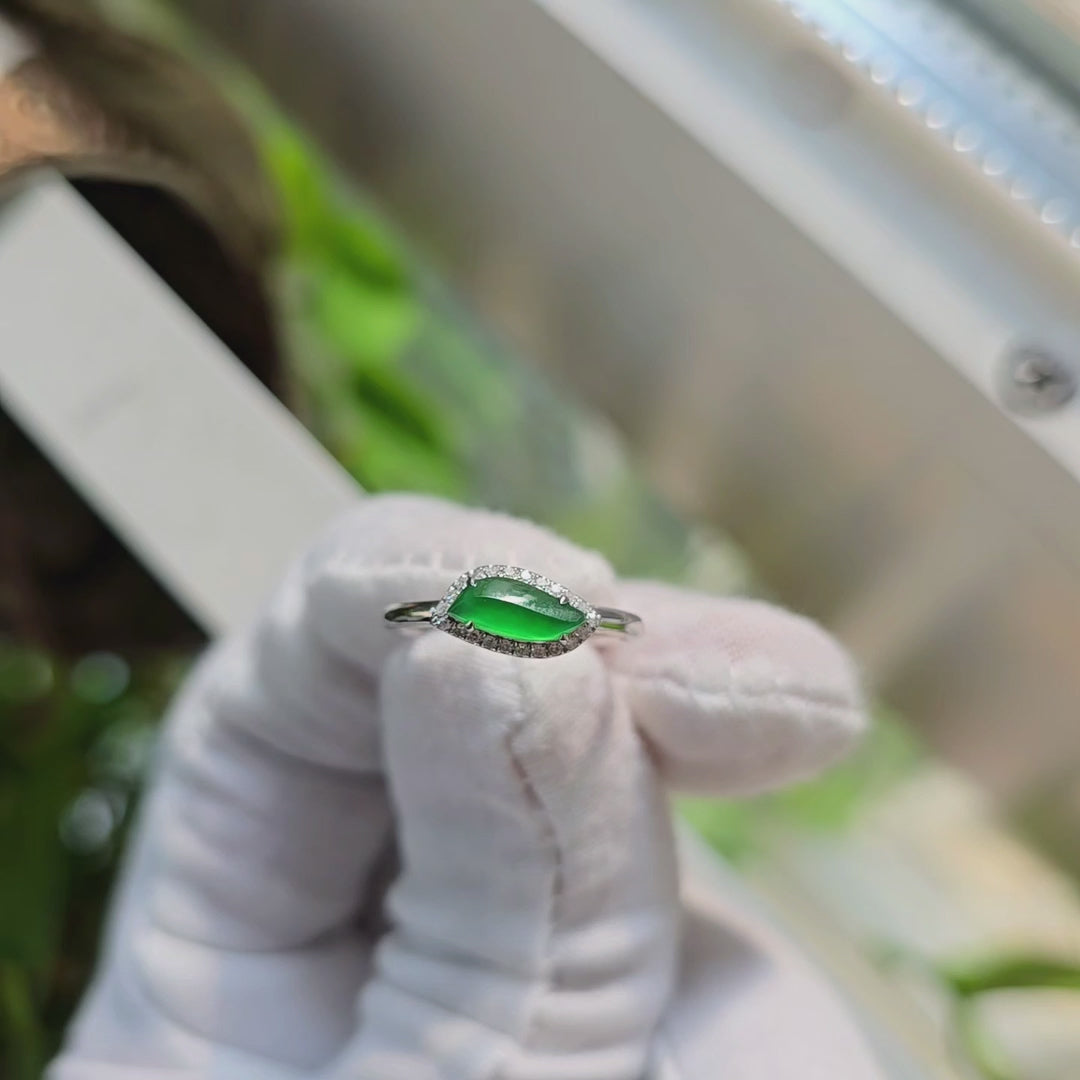 From the depths of vivid Imperial Green Burmese A-Jadeite, luminous and pure as flowing life itself, emerges a jewel of rare intensity—bold, eternal, and profoundly unique. Crowned with a halo of natural white diamonds and set in radiant 18K white gold, this one-of-a-kind leaf-shaped cabochon radiates strength and elegance, made to command both daylight and evening allure.