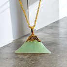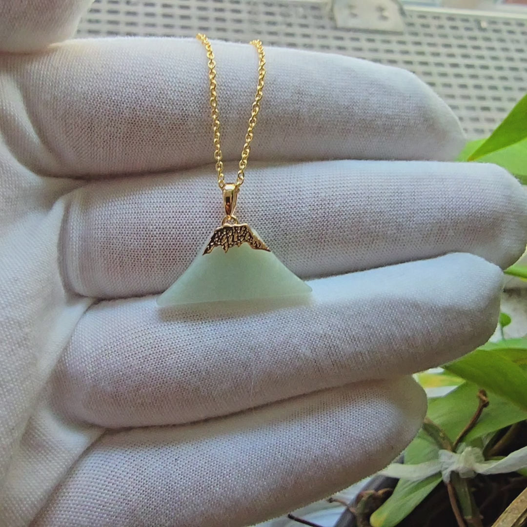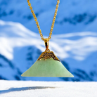 A hand-carved Burmese Jadeite pendant inspired by Mount Fuji, crowned with yellow gold to parallel the paradoxical nature of sunlight over white snow. Each stone is natural, untreated, and uniquely marbled— silently powerful in form and meaning.