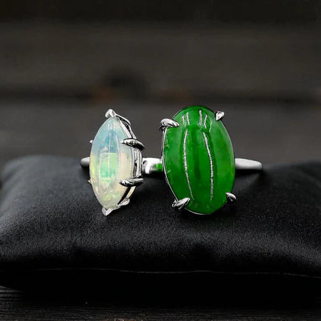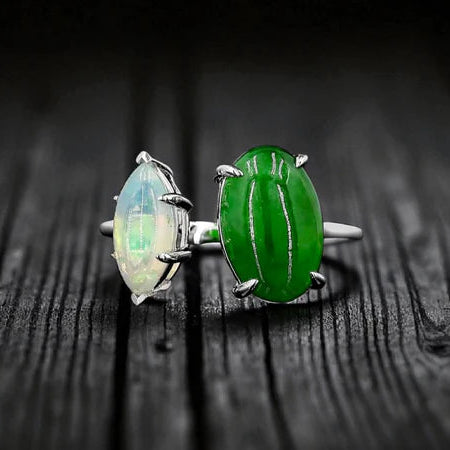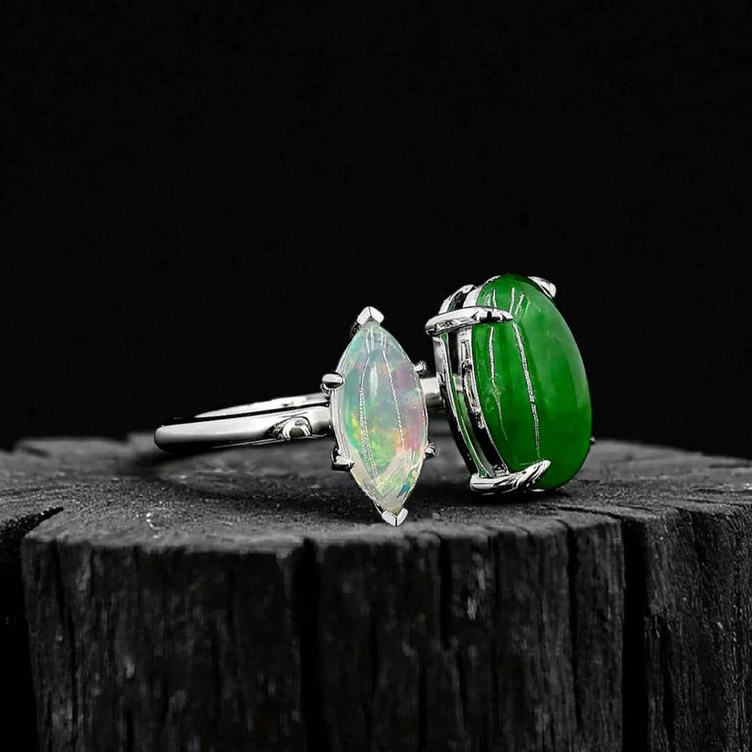 Crafted in solid 14K white gold, the earrings feature vivid, untreated Burmese A-Jadeite cabochons and luminous Australian White Opals , creating FYORO’s signature contrast of mystical depth and fiery brilliance. Each jadeite stone is one-of-a-kind, with unique marbling and translucency, while the opals display flashes of red with blue and green undertones. Certified by GE Laboratory, Japan, and cut and made in Hong Kong, this exclusive design embodies elegance, individuality, and purpose.